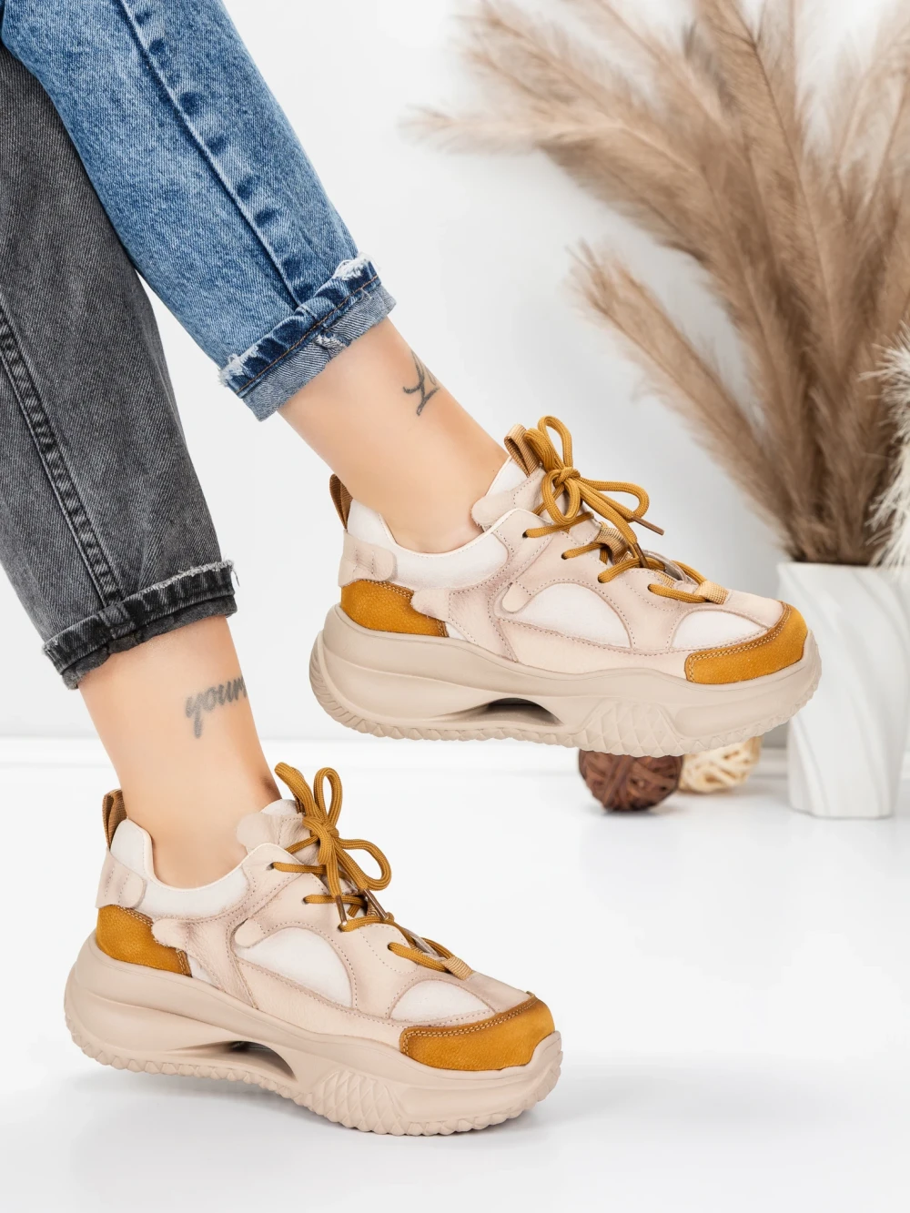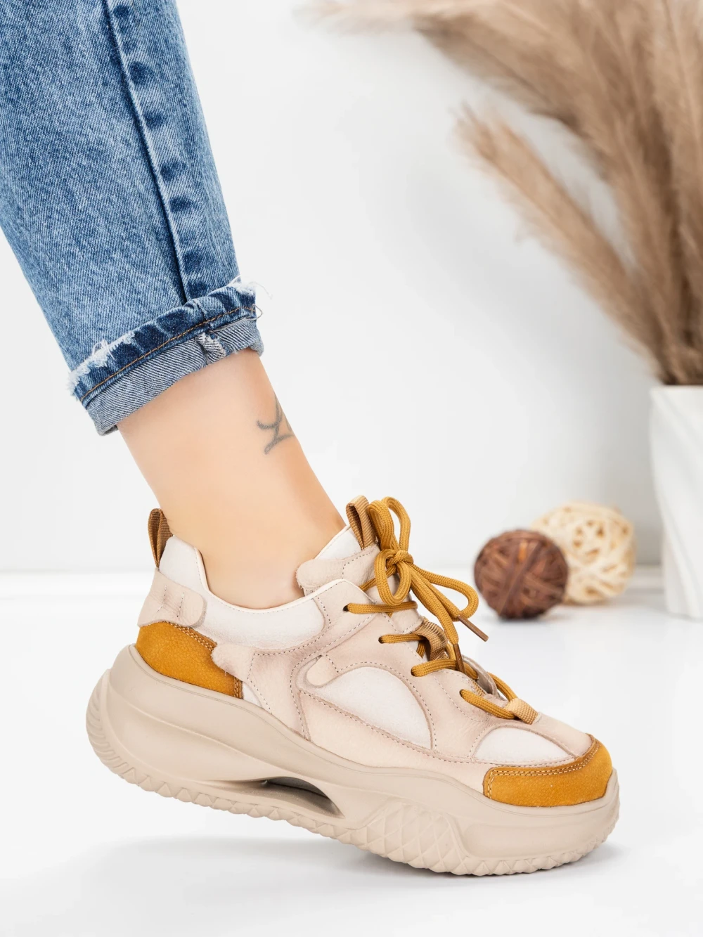 Ženske sportske cipele od prirodne kože 2576 Krem-Žuta | Advancer